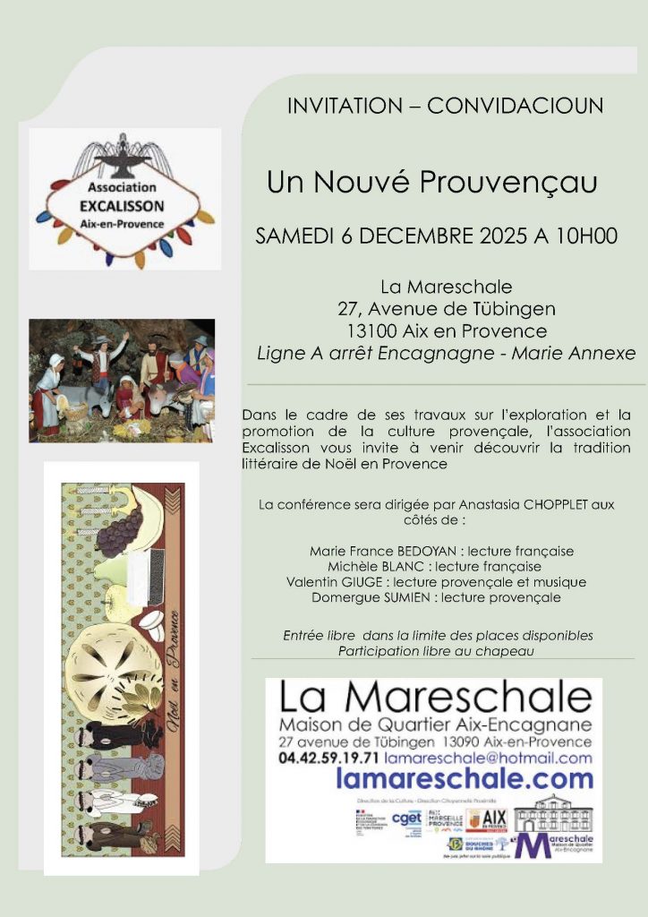 Un Nouvé Prouvençau – Samedi 6 décembre 2025 à 10h00 Publié le novembre 5, 2025 | Par formoc La Maréschale 27, avenue de Tübigen 13100 Aix-en-Provence Ligne A arrêt Encagnagne – Marie Annexe Partager la publication "Un Nouvé Prouvençau – Samedi 6 décembre 2025 à 10h00" FacebookTwitterPartager...